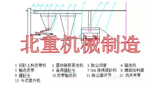 人工落砂后,舊砂通過上料皮帶機(jī)進(jìn)入振動(dòng)落砂機(jī)完成落砂、破碎、篩分,再生,經(jīng)過帶由磁選的輸送皮帶進(jìn)入斗式提升機(jī),在輸送過程中人工加入新砂。在斗提的出口處安裝風(fēng)選裝置,經(jīng)過風(fēng)選的型砂經(jīng)皮帶輸送機(jī)進(jìn)入儲砂斗。劃線平臺鑄件生產(chǎn)時(shí),型砂從砂斗經(jīng)螺旋給料器進(jìn)入混砂機(jī)。